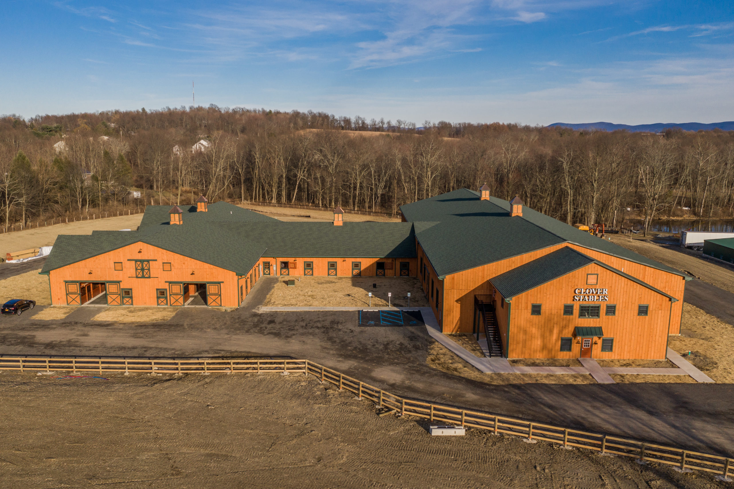 Large barn featuring a 78′ x 156′ x 14′ double center aisle barn with Two- 36′ front reverse dormers, One- 16′ x 12′ x 12′ timbered breezeway entry and One- 36′ x 78′ x 12′ reverse gable stall barn that attaches to the 84′ x 224′ x 20′ indoor arena with a two story viewing room.