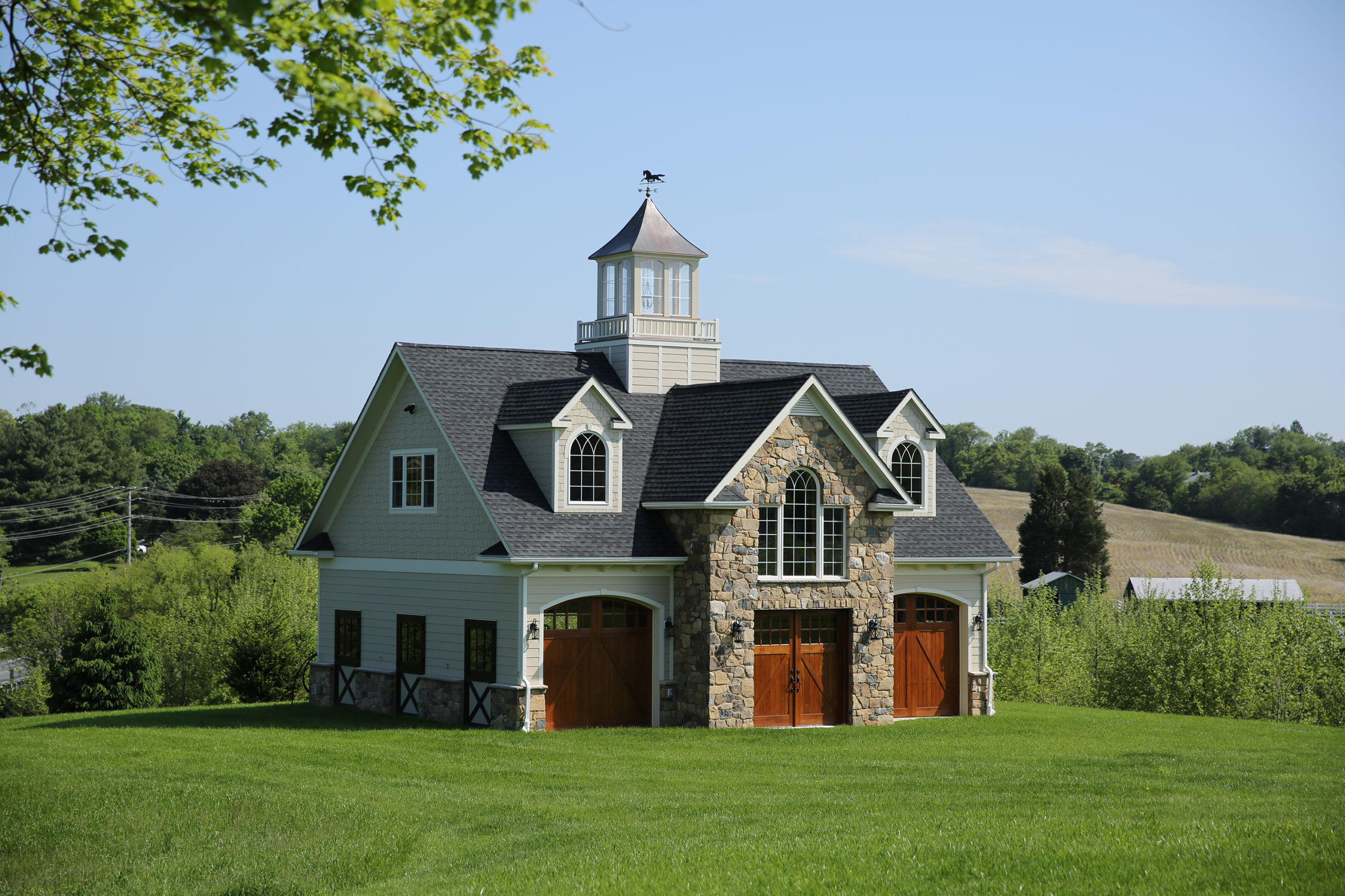 Multi-use building with parking for antique cars and a finished loft for family activities; this barn was designed to allow conversion to a horse barn in the future. Two 9’x9′ arched top King custom overhead doors in Spanish cedar; 8’x8′ square topped King custom carriage door in Spanish cedar at the center entry. Stone work is 6″ genuine stone; siding is Hardi-Plank with Hardi shingles on the dormers. There are seven Dutch doors with fixed base; the interior of the barn has two large Euro stalls (12’x17′ and 12’x20′) that currently stable the antique cars. King custom cupola with glass top, copper roof and decorative railing.